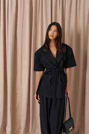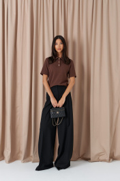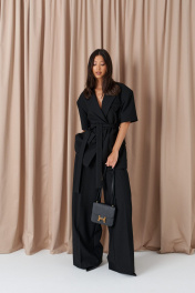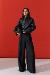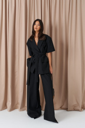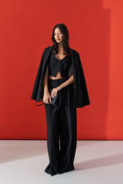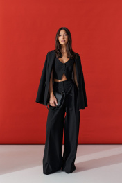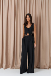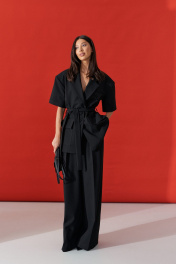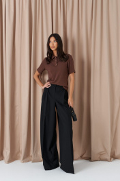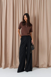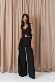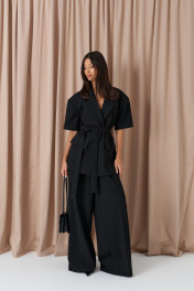 Брюки-палаццо свободного кроя. Выполнены из текстильного полотна черного цвета. В боковых швах карманы с отрезным бочком. Стабильный пояс без шлевок. По передузастежка молния и пуговица. Длина 113 см