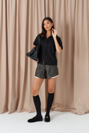 Шорты свободного кроя выполнены из эко-кожи. Характеристика: стабильный пояс, засежка молния и петля-пуговица, по низу изделия нашито декоративное кружево, брендированная подкладка. Длина по боковому шву 39 см.