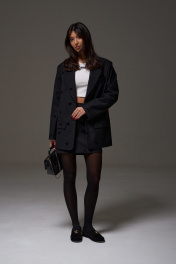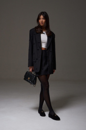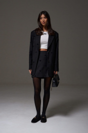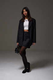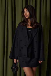 Юбка-мини прямого кроя выполнена из костюмной ткани черного цвета, декорированной черными сердечками. Характеристики: силуэт - трапеция, брендированная подкладка, застежка - потайная молния в шве заднего полотна изделия. Длина 42см.