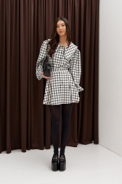 Блузка прямого свободного кроя выполнена из хлопкового полотна в черно-белую клетку. Характеристики: горловина овальный вырез вырез, воротник крупный, украен оборками, застежка центральная на пуговицах. Рукав широкий втачной со сборкой, внизу манжет на две пуговицы. Длина по спинке 59 см, длина рукава 73 см.