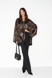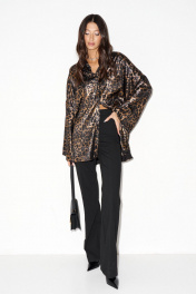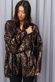 Рубашка прямого свободного кроя выполнена из легкой струящейся ткани, принт леопард. Характеристики: прямой свободный крой, воротник рубашечного типа, застежка центральная на петли пуговички. По переду нашиты два крупных кармана . Рукав спущен, свободного кроя, в боковых швах разрезы. Длина изделия 72 длина рукава от края горловины 75 см.