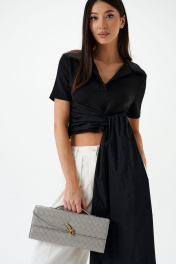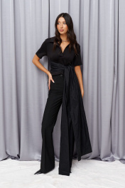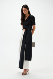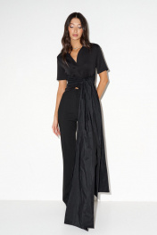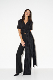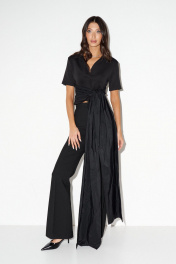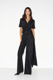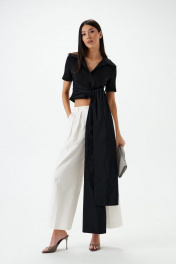Джемпер прямого кроя выполнен из трикотажного полотна черного цвета с декоративными лентами, вшитыми в боковой шов, которые можно завязать в бант Характеристики: прямой крой, отложной воротник, застежка поло без пуговиц, рукав втачной короткий,. Длина изделия 43см, длина рукава 22см.