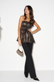 Блузка на вергерке выполнена из струящейся ткани в принт леопард. Характеристики: открытые плечи, верх на резинке, по талии венгерка, низ свободного кроя. Длина изделия по спинке 50 см.