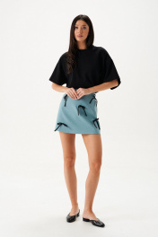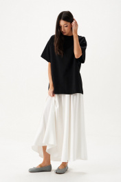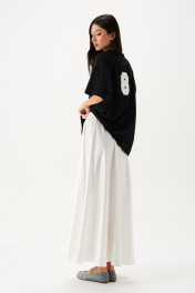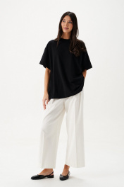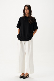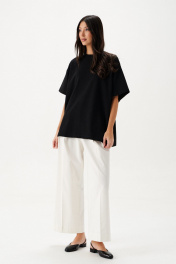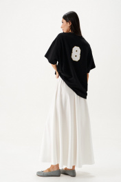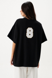 Футболка прямого свободного кроя, выполнена из черного хлопкового полотна . Характеристики: прямой свободный крой, горловина овальная, рукав слегка спущен, на спинке апликация в виде восьмерки . Длина по центру спинки от края горловины 66 см, длина рукава от края горловины 38 см.
