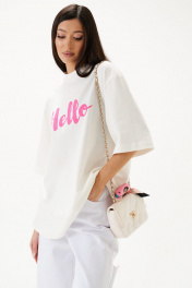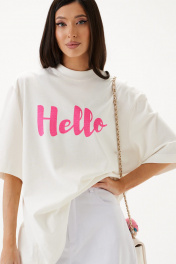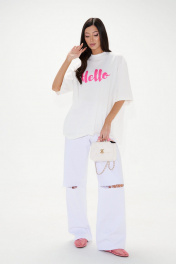 Футболка прямого свободного кроя, выполнена из хлопкового полотна тепло-белого цвета . Характеристики: прямой свободный крой, горловина круглая, рукав слегка спущен, горловина и край рукава выполнены из довяза, спереди принт розового цвета. Длина по центру спинки от края горловины 70 см, длина рукава от края горловины 45 см.