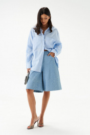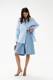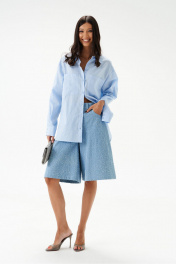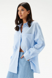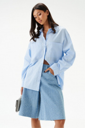 Рубашка свободного кроя. Выполнена из льняного хлопкогово полотна голубого цвета. Прямой крой. Горловина круглая с отложным воротником на стойке. Рукав втачной, немного спущен, с манжетой с пуговичками. В боковых швах разрезы 27 см. Длина рукава от края горловины 76 см. Длина рубашки по спинке 71 см.