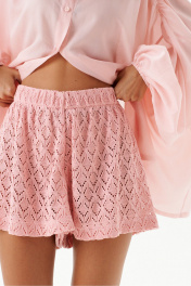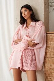 Рубашка свободного кроя, выполнена из полотна розового цвета. Воротник отложной на стойке. По плечевым швам сборка. Рукав втачной, со спущенной линией плеча, низ рукава на резинке. Спинка цельная. Застежка центральная пуговицы. Низ прямой. Длина рукава от края горловины 73 см. Длина по спинке 73 см.