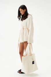 Кардиган свободного кроя. Выполнен из фактурного хлопкового полотна светло-бежевого цвета. Рукав втачной, спущенный. На уровне линии талии шлёвки. В комплекте пояс из ткани основного изделия. Длина рукава от линии втачивания 55 см. Длина спинки 74 см
