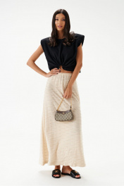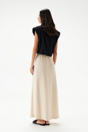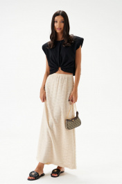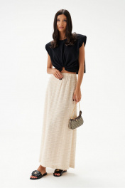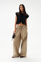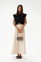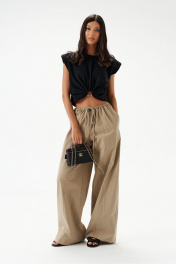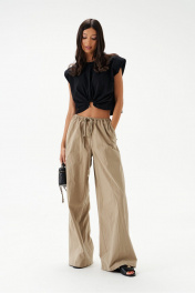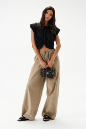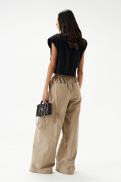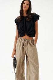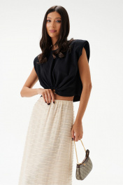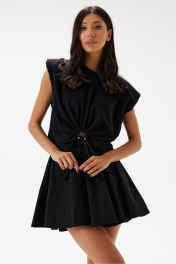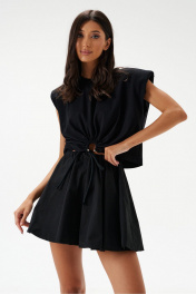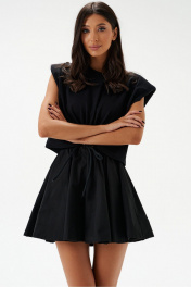 Футболка свободного кроя без рукавов. Выполнена из хлопкового полотна чёрного цвета. Выпез горловины круглый. Подплечники (съёмные). По переду декоративная сборка на полукольцо серебристого цвета. Длина спинки 42,5 см