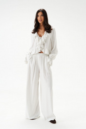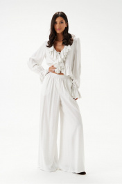 Блузка из текстильного полотна белого цвета в мелкий горошек, свободного облегания, укороченная.Горловина V-образная, с притачной рюшей по всей длине горловины, борта и низа. Застежка на шнурки- завязки.Рукав одношовный, длинный заканчивающийся притачной манжетой в виде волана. Длина рукава 69 см. Длина по спинке 50 см.