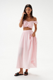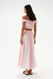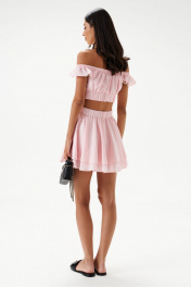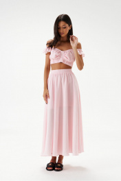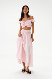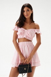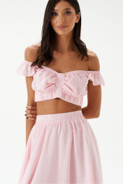 Укороченный топ, выполнен из текстильного полотна нежно-розового цвета. Характеристики: фигурный вырез горловины. По переду и по спинке лифа резинка со сборкой. Бретели с резинками и декоративным элементов, в виде рюш. Застёжки нет. Длина по спинке 20 см.