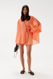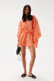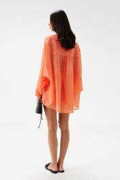 Рубашка свободного кроя. Выполнена из мягкого полупрозрачного полотна оранжевого цвета. Горловина – стойка. Рукав втачной, широкий, «летучая мышь», к низу сужается. Спинка отрезная с кокеткой, со сборкой. Застёжка центральная - пуговички. Длина рукава от линии втачивания 57 см. Длина спинки 82 см.
