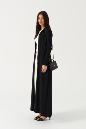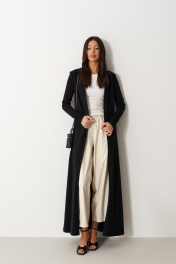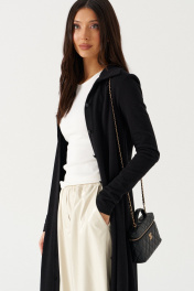 Джемпер удлиненный свободного кроя, выполнен из трикотажа черного цвета. Характеристика: свободный крой, расширение к низу, отложной воротник, застежка центральная на пуговицы, цельнокройная спинка, рукав вточной. Длина изделия по спинке 142см, длина рукава 64см.