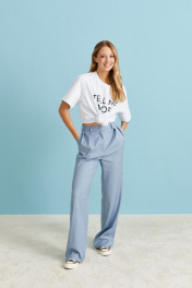 Брюки прямого кроя выполнены из костюмной ткани. Базовая модель для делового гардероба. Характеристики: прямой крой, стабильный пояс, по поясу нашиты шлевки, декоративные складки по переду изделия, боковые карманы. Длина брюк 114 см.