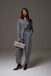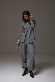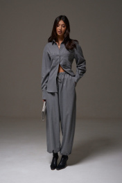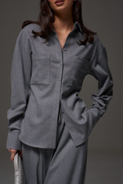 Рубашка прямого кроя, выполнена из текстильного полотна серого цвета. Воротник отложной. Рукав немного спущенный, втачной, с манжетой. Функциональные накладные карманы по переду изделия. Спинка с отрезной кокеткой и встречными складками. Застежка по переду на пуговицах. Длина рукава от линии втачивая 61 см. Длина спинки 66 см