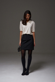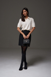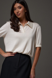 Джемпер прямого кроя выполнен из трикотажного полотна молочного цвета. Характеристики: прямой крой, отложной воротник, в области горловины застежка на планке на петли пуговички, рукав втачной короткий на резинке, низ джемпера заканчивается резинкой. Длина по спинке 52 см, длина рукава 26 см.