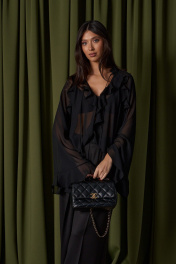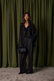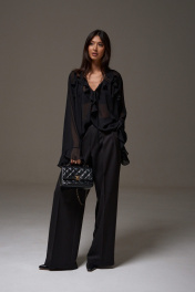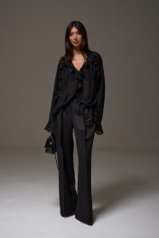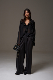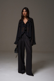 Блузка прямого свободного кроя, выполена из легкой, прозрачной ткани черного цвета. Характеристика: прямой крой, воротник стойка, со сборкой. К горловине пришита рюша с переходом на спинку изделия. Шнурки - завязки функциональные. Рукав свободного прямого кроя, по низу пришита рюша. Длина спинки 63см, длина рукава 76см.
