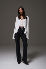 Блуза свободного кроя. Выполнена из мягкого полупрозрачного полотна тёплого белого цвета. Вырез горловины V-образный, с воланом по всей длине (переходит на спинку). Рукав втачной, спущенный, по низу волан с кулиской. Низ блузы по переду фигурный с воланом, волан переходит на спинку. Застёжка центральная - завязки. Длина рукава от линии втачивания 72 см. Длина спинки 71 см