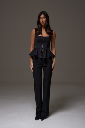 Топ прилегающего силуэта. Выполнен из плотного трикотажного полотна чёрного цвета. Топ двухслойный. Вырез горловины круглый. Широкие бретели. По низу баска. Застёжка центральная - молния. Длина спинки (с баской) 53 см