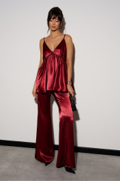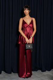 Топ свободного кроя. Выполнен из мягкой струящейся ткани бордового цвета. Вырез декольте V-образный. Лиф двойной, с фигурным отрезом. Бретели регулируемые. Длина по боковому шву (с учётом лифа) 47 см