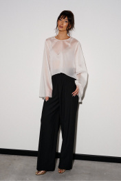 Блузон свободного прямого кроя, выполнен из тонкого белого полотна. Характеристика: свободный крой, овальная горловина. Рукав втачной, свободного кроя, расклешенный к низу. Спинка цельнокроеная, по переду изделия срез. Длина по спинке 71см, длина рукава от края горловины 79см.