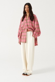 Рубашка прямого свободного кроя, выполнена из ворсистого полотна розового цвета в коричневую клетку. Характеристика: воротник отложной, застёжка центральная на пуговицы, по переду справа на уровне линии груди карман, слева - брендированная нашивка Annete, рукав спущенный свободный, с широкой манжетой на пуговице, спинка отрезная с скоалками. Длина рукава от края горловины 77 см. Длин по центру спинки от края горловины 77 см.