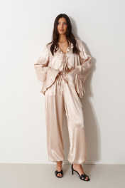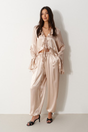 Блуза свободного кроя, выполнена из мягкого струящейся ткани телесного цвета. Характеристика: вырез горловины V-образный, с воланом по всей длине (переходит на спинку), центарльная застежка на завязки, рукав втачной, спущенный, по низу волан с кулиской, низ блузы по переду фигурный, с воланом переходящим на спинку. Длина рукава от линии края горловины 84 см. Длина по центру спинки 71 см
