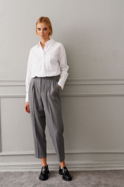 Брюки прямого кроя выполнены из костюмной ткани. Базовая модель для делового гардероба. Характеристики: прямой крой, стабильный пояс, по поясу нашиты шлевки, декоративные складки по переду изделия, боковые карманы. Длина брюк 100 см.