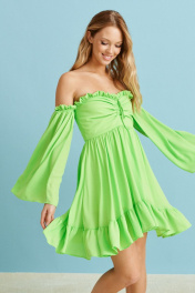 Платье прямого свободного кроя выполнено из яркого полотна цвета яркий лайм. Яркий сочный летний образ. Характеристики: прямой свободный крой, подкладка, фигурный вырез горловины, по переду декоративная сборка с кулисой, рукав в изделии спущен, по верху рукава резинка, по периметру рукава и горловины платье украшено декоративной сборкой из ткани основного изделия, застёжка потайная тесьма молния в среднем шве заднего полотна изделия, по низу нашит волан. Длина по спинке 66 см, длина рукава 49 см.