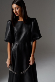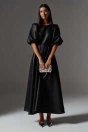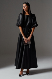Платье полуприлегающего силуэта с объемными рукавами выполнено из фактурного полотна черного цвета. Роскошное платье для важного мероприятия. Характеристики: полуприлегающий силуэт, отрезное, горловина овальная, рукава объёмные акцентные, застёжка потайная тесьма молния в среднем шве заднего полотна изделия, юбка в изделии свободного кроя. Длина по спинке 137 см, длина рукава 42 см.