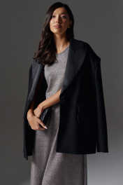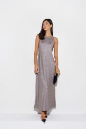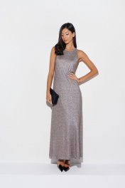 Изящное платье полуприлегающего силуэта выполнено из ткани с люриксовой нитью. Характеристики: полуприлегающий силуэт, горловина овальная, без рукава. Длина по спинке 138 см.
