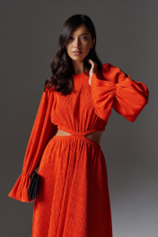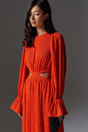 Платье полуприлегающего силуэта с декоративным разрезом выполнено из фактурного полотна оранжевого цвета. Характеристики: полуприлегающий силуэт, отрезное, по линии талии декоративный разрез разъединяющий верхнюю и нижнюю часть изделия, горловина овальная, рукав втачной, застежка потайная тесьма молния в среднем шве заднего полотна изделия, низ платья свободного кроя на подкладке.