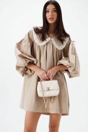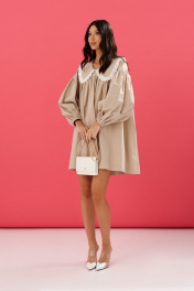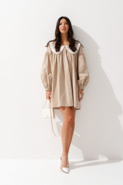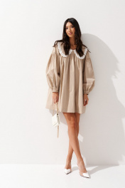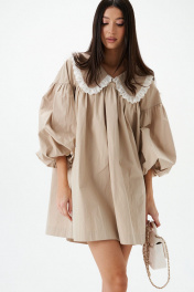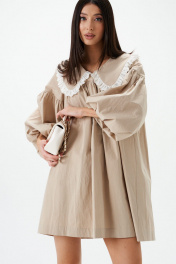 Платье прямого свободного кроя выполнено из хлопкового полотна цвета беж с акцентным воротником. Характеристики: прямой свободный крой, отрезное, отложной крупный воротник декорирован по периметру кружевом , рукав спущен , объемный, по низу рукава резинка. Длина по спинке 85 см, длина рукава от края горловины 63 см.