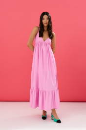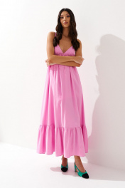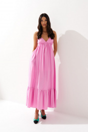 Платье свободного кроя на бретелях. Характеристики: полуприлегающий силуэт, подкладка, отрезное, фигурный вырез горловины, регулируемые бретели, по спинке частично венгерка,в боковых швах карманы, по низу нашит волан. Длина от верхнего края бретели 135 см.
