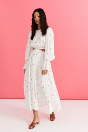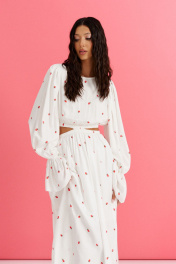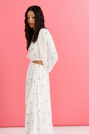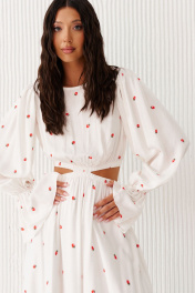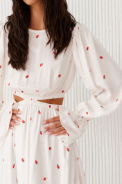 Платье полуприлегающего силуэта выполнено из белого полотна с ягодным принтом. Характеристики: полуприлегающий силуэт, овальная горловина, отрезное с декоративным вырезом по отрезу, по линии отреза по нижней и верхней части изделия резинка, низ изделия на подкладке, рукав втачной по низу рукава в области запястья резинка, застежка петля - пуговичка по спинке.