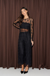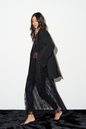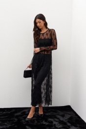 Платье А-силуэта, выполнено из прозрачного черного полотна в сеточку с вышитыми цветами. Характеристики: платье полуприлегающего А-силуэта, горловина овальная, рукав втачной, нижний край изделия и рукавов не обработаны. Длина по спинке от края горловины 129 см.