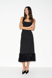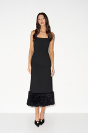 Платье-миди прилегающего силуэта. Выполнено из текстиля чёрного цвета. Отрезное по линии талии. Вырез-декольте глубокий квадратный. Спинка закрытая. По низу декорировано эко-мехом в чёрном цвете. Застежка потайная молния в среднем шве заднего полотна изделия. В юбке изделия в среднем шве заднего полотна разрез 22 см. Длина спинки 124 см