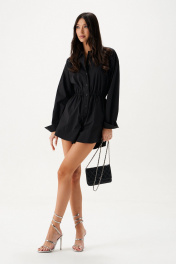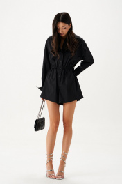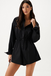 Комбинезон полуприлегающего силуэта. Выполнен из хлопкового полотна черногоцвета. Воротник отложной. Рукав втачной, немного спущен. Рукав с манжетой с пуговичкой. Застёжка центральная - планка с пуговичками. Спинка отрезная. По линии талии таже отрез по линии талии на резинке. Шорты свободного кроя. В боковых швах карманы. Длина спинки до линии талии 41 см, длина рукава 56 см, длина шорт 35 см