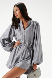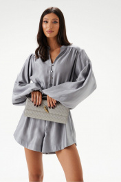 Комбинезон приталенного силуэта. Выполнен из полотна небесно-перламутрового цвета с блеском. Застежка на петли и пуговицы. Воротник стойка, V-образный вырез. Рукав втачной, с резинкой внизу. Шорты комбинезона прямые, свободные, в боковых швах потайные карманы. По линии талии кулиса на резинке. Длина спинки 84 см. Длина рукава от края горловины 77 см
