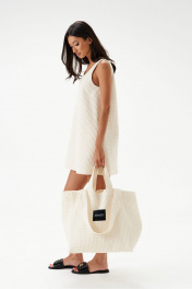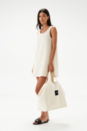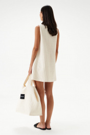 Платье-мини А-силуэта. Выполнено из фактурного хлопкового полотна светло-бежевого цвета. С подкладкой. Вырез горловины круглый. В боковых швах карманы. Застёжки нет. Длина спинки 76 см