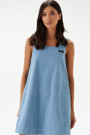 Платье в крое - трапеция, выполнено из джинса с эффектом потретости. Горловина овальная. В боковых швах потайные карманы. По центру спинки расположен шов.Длина по спинке 76 см