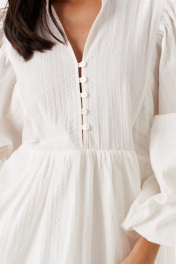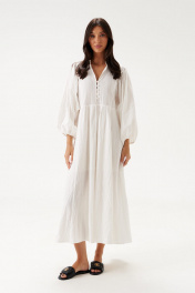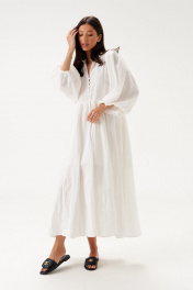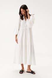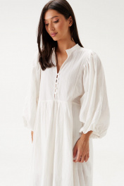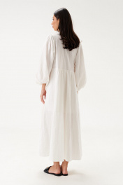 Платье выполнено из хлопкового полотна белого цвета. Характеристики: воротник-стойка, застежка центральная на пуговицы, рукав втачной "летучая мышь" на резинке , отрезное по поясу, юбка-трапеция, на подкладке. Длина изделия по спинке 128см, длина рукава 55см.