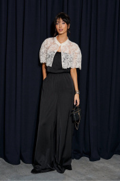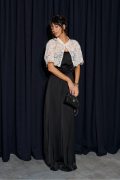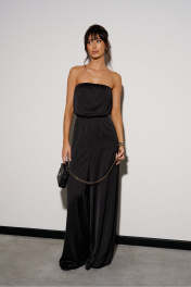 Комбинезон с открытыми плечами полуприлегающего силуэта. Выполнен из мягкой струящейся ткани чёрного цвета. Без застёжки. Линия декольте на резинке. Лиф выполнен из двойной ткани. Отрез по линии талии на резинке. В боковых швах брючин карманы. Длина по боковому шву 135 см.