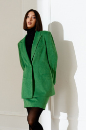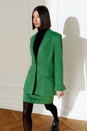 Комплект двух предметный состоящий из жакета и юбки. Жакет прямого свободного кроя на подкладке с подплечниками. V образный вырез горловины. Воротник пиджачного типа, остроугольные лацканы. Застежка центральная на петлю пуговицу. По переду прорезные карманы. Рукав втачной одношовный, по низу рукава разрезы. Спинка со средним швом. Длина изделия 73, длина рукава 61. Юбка прилегающего силуэта. Пояс стабильный. Застежка - потайная тесьма молния в среднем шве заднего полотна изделия. Длина юбки 52 см.