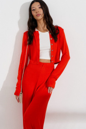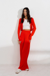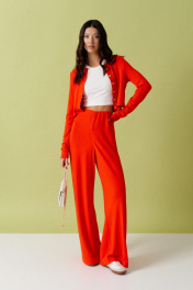 Комплект состоит из джемпера и брюк выполнен из трикотажного полотна оранжевого цвета. Характеристики: джемпер укороченный, V образный вырез горловины, застежка центральная на петли пуговички, пуговички выполнены в виде сердец, рукав втачной. Длина по спинке 42 см, длина рукава 70 см. Брюки прямого кроя , пояс брюк на резинке на подгибе. Длина 106 см.
