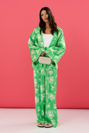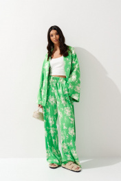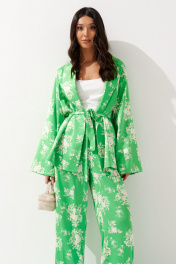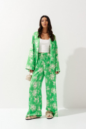Комплект состоит из туники и брюк выполнен из яркого зеленого полотна с цветочным принтом. Характеристики: туника прямой крой,подкладка, отложной воротник , по линии талии нашиты шлевки, в комплекте пояс из ткани основного изделия, рукав втачной, свободного кроя с разведением к низу. Длина по спинке 69 см, длина рукава 67 см. Брюки прямого свободного кроя, пояс на резинке с кулиской, в боковых швах карманы. Длина брюк 112 см.