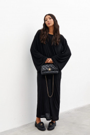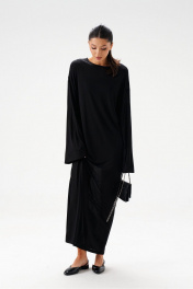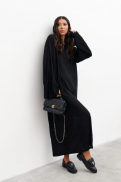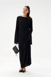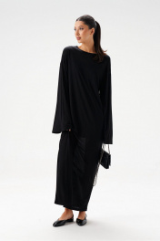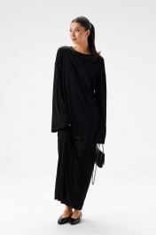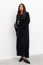 Комплект состоит из двух платьев: платье на бретелях и платье прямого свободного кроя. Выполнен из полупрозрачного трикотажного полотна черного цвета. Характеристики:нижнее платье полуприлегающего силуэта, А-образный силуэт, бретели - не регулируемые. Длина по спинке 65 см. Верхнее платье прямого свободного кроя, горловина овальная, рукав спущен. Длина по спинке от края горловины 131 см, длина рукава от края горловины 75 см.