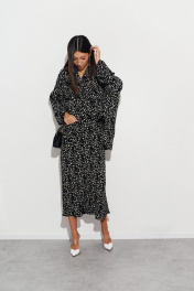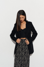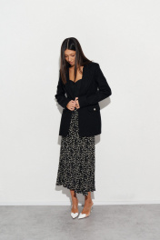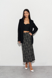 Стильная юбка полуприлегающего силуэта выполнена из струящегося полотна черного цвета с контрастным принтом белые цветы. Характеристики: полуприлегающий силуэт, подкладка, пояс на резинке. Длина по боковому шву 100 см.