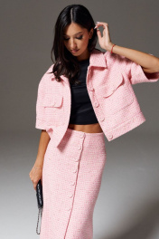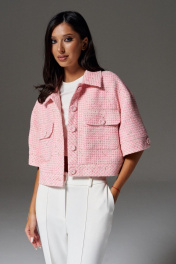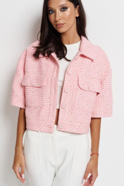 Укороченный жакет выполнен из фактурной ткани розового цвета с добавлением золотой нити. Характеристики: укороченный, подплечники, подкладка, воротник отложной, застежка на планке - пуговички петли, по передней части изделия крупные накладные карманы, рукав слегка спущен, по низу рукава манжета на пуговичке. Пуговички в изделии декорированы тканью основного изделия. Длина по спинке 47, длина рукава 47 см от края горловины.