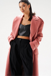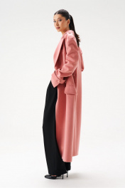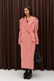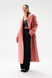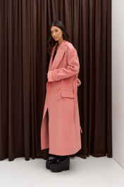 Пальто двубортное. Выполнено из пальтовой ворсовой ткани нежного розового цвета. Есть подклад. Воротник отложной с широкими лацканами. Застежка центральная на петли пуговицы (обтянуты тканью основного изделия). Рукав втачной, немного спущен, есть подплечники, по низу рукава пата с пуговицей. Длина рукава 61 см. По линии плеча погон с пуговицей. Карман листочка с клапаном. В комплекте пояс из ткани основного изделия. По центру спинки шлица 59 см. Длина спинки 128 см.